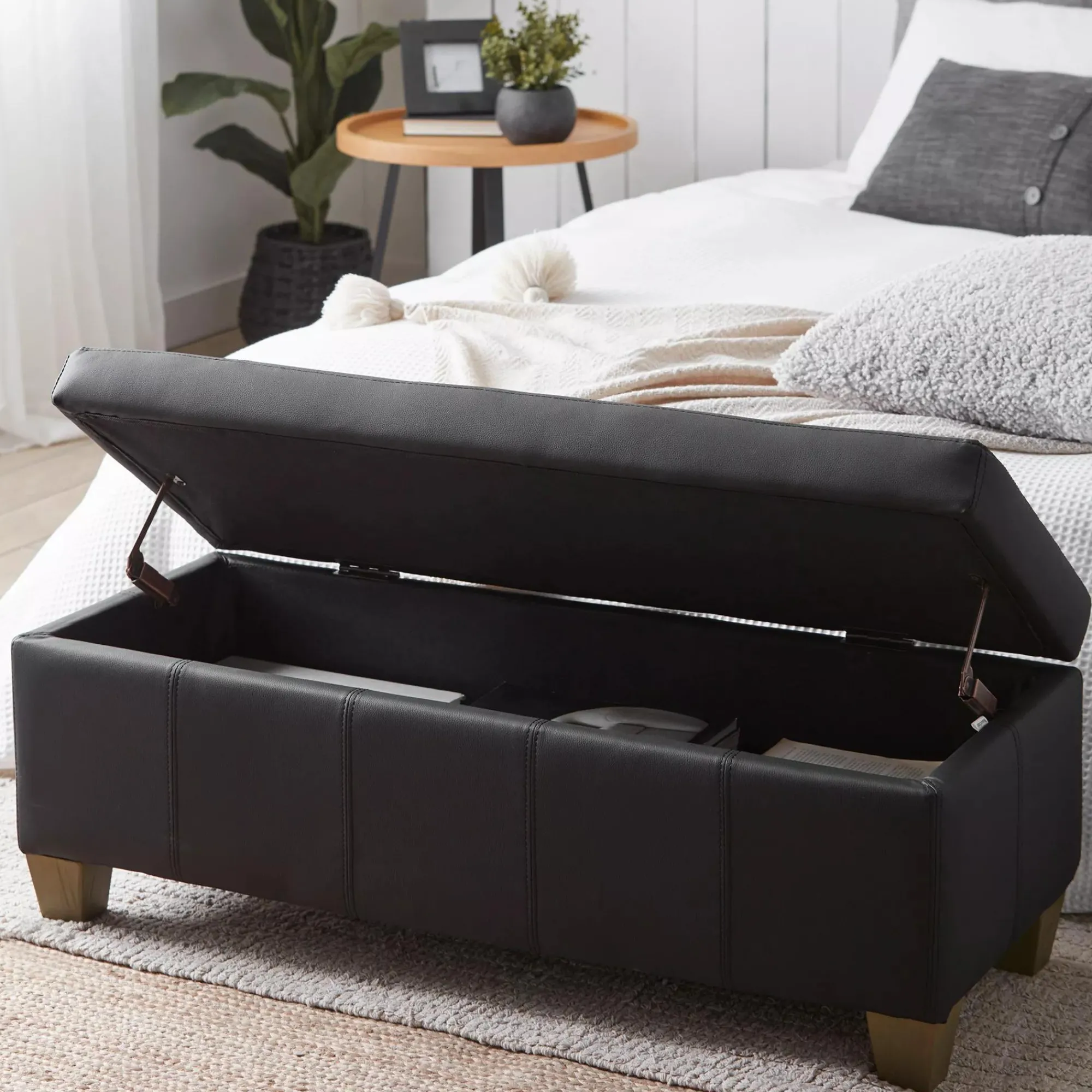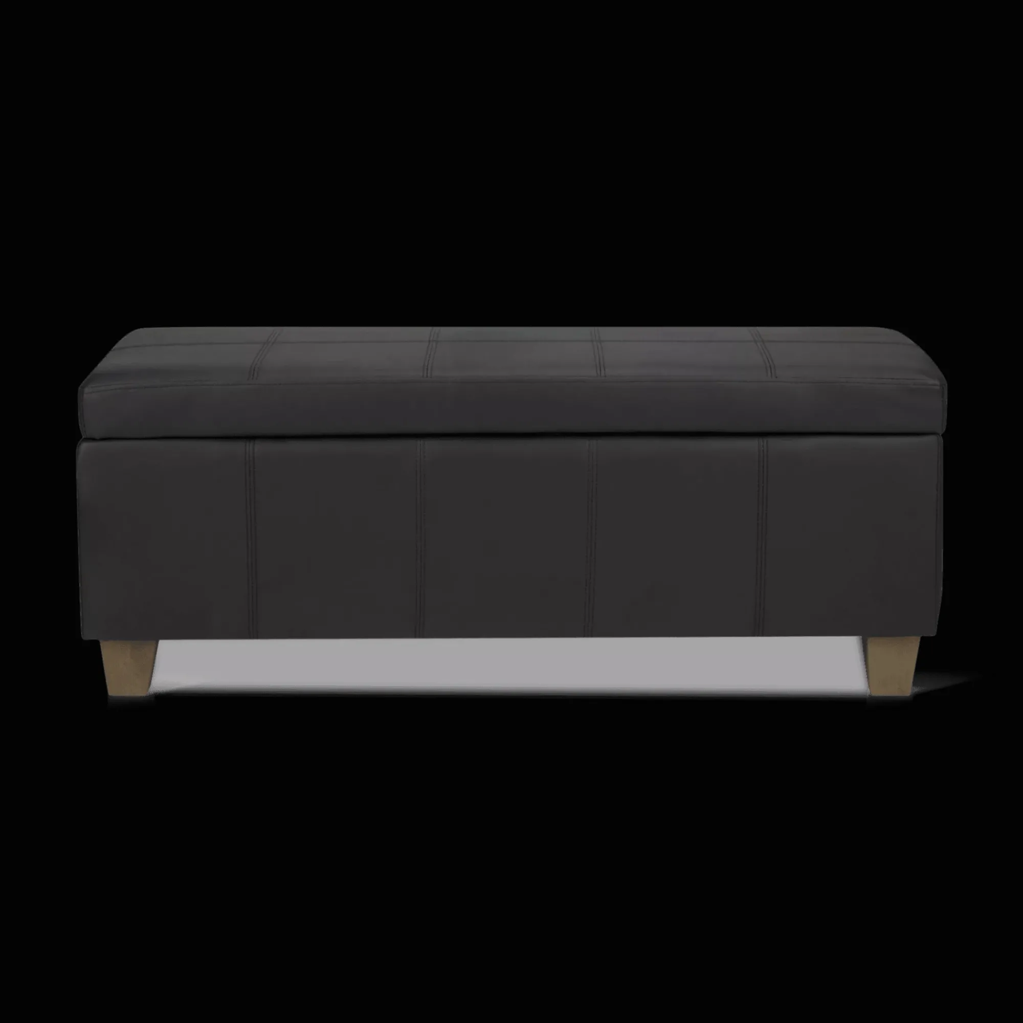 Bring this stylish lidded ottoman into your decor and it’ll soon become the hardest working piece of furniture in your home corralling clutter storing extra blankets and out-of-season clothing or serving as an alternative to a coffee table. Made of faux leather this modern piece sits upon grey legs to deliver the perfect mix of function and fashion. Use it in your entryway bedroom or living room to stash all your stuff and enjoy your newly tidied space.