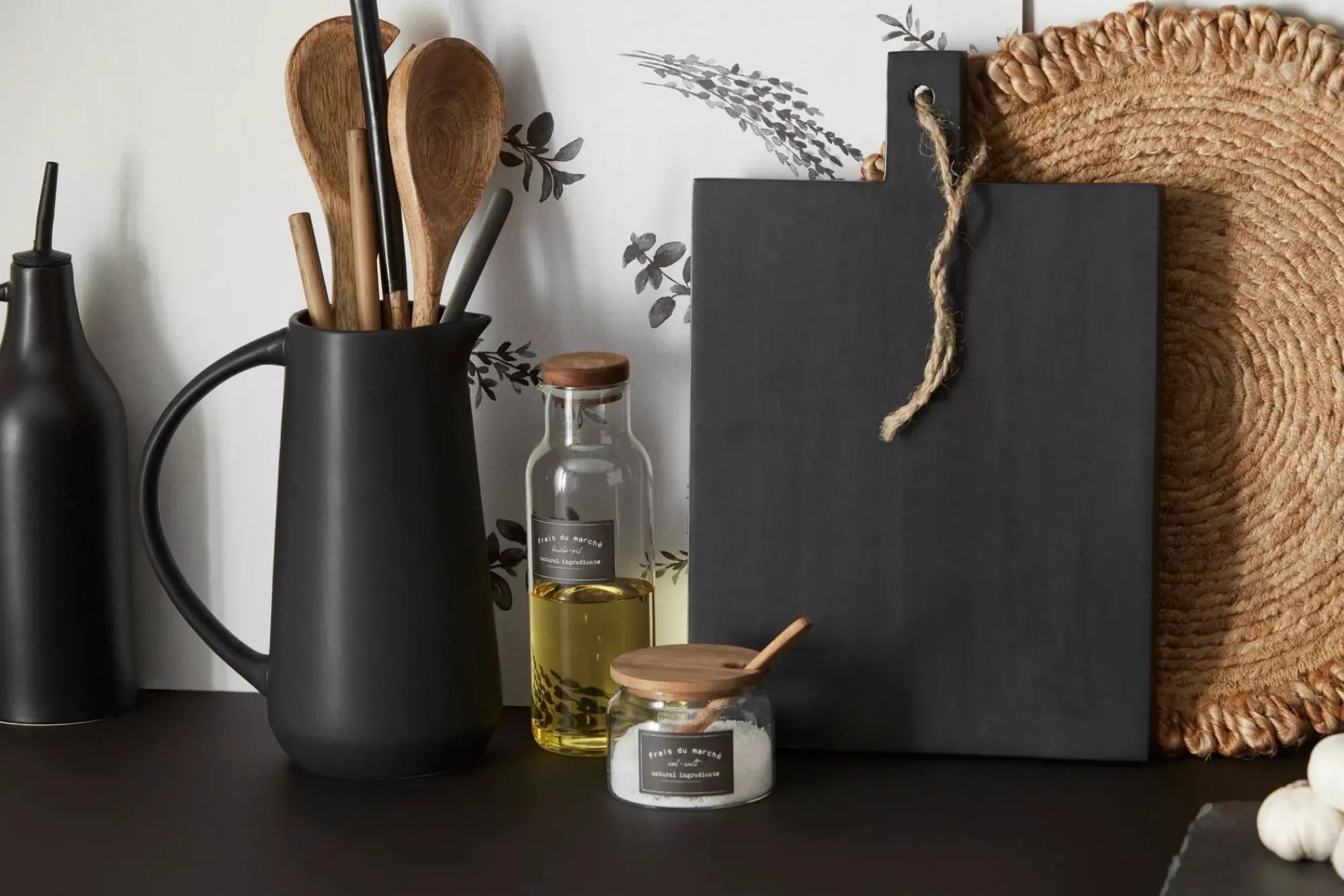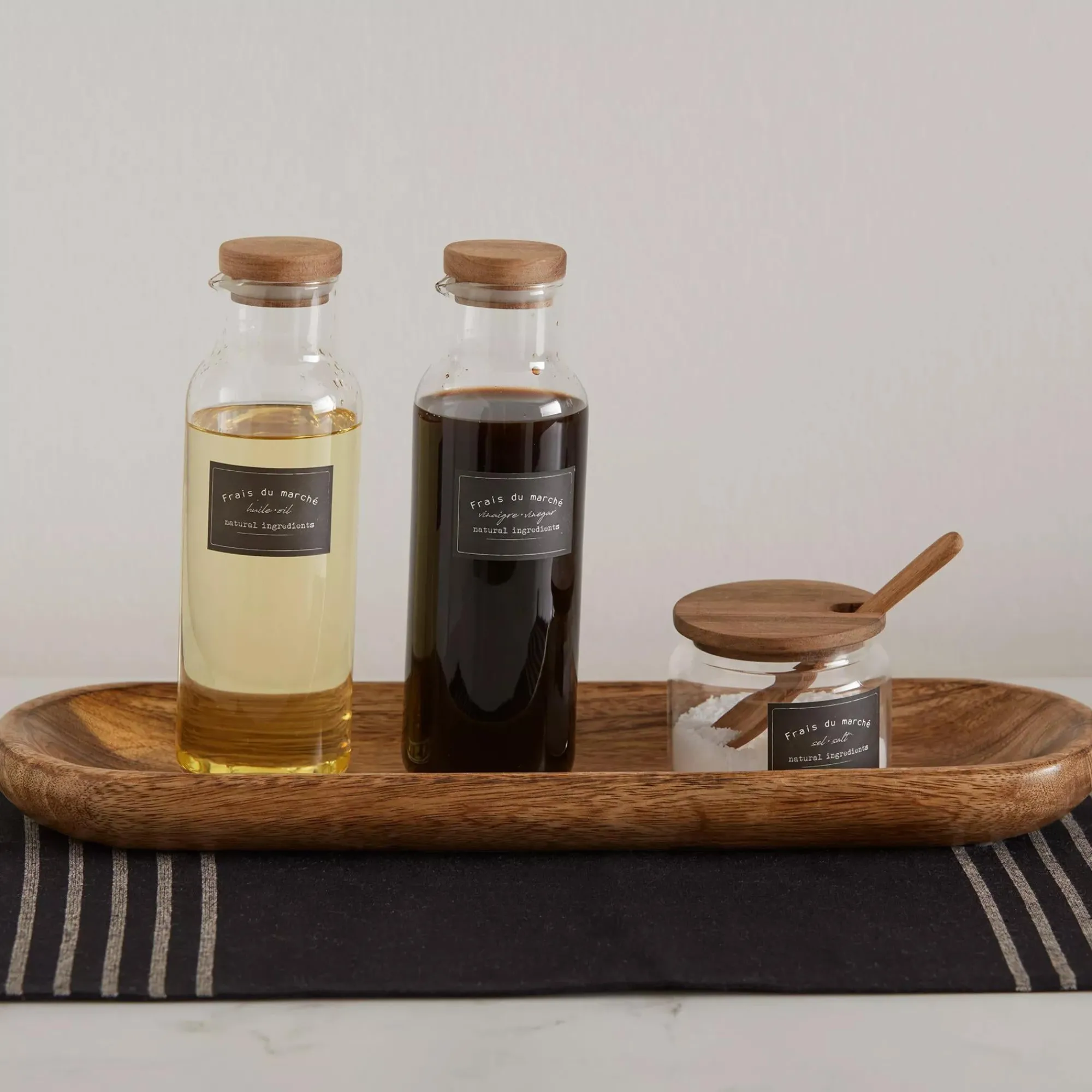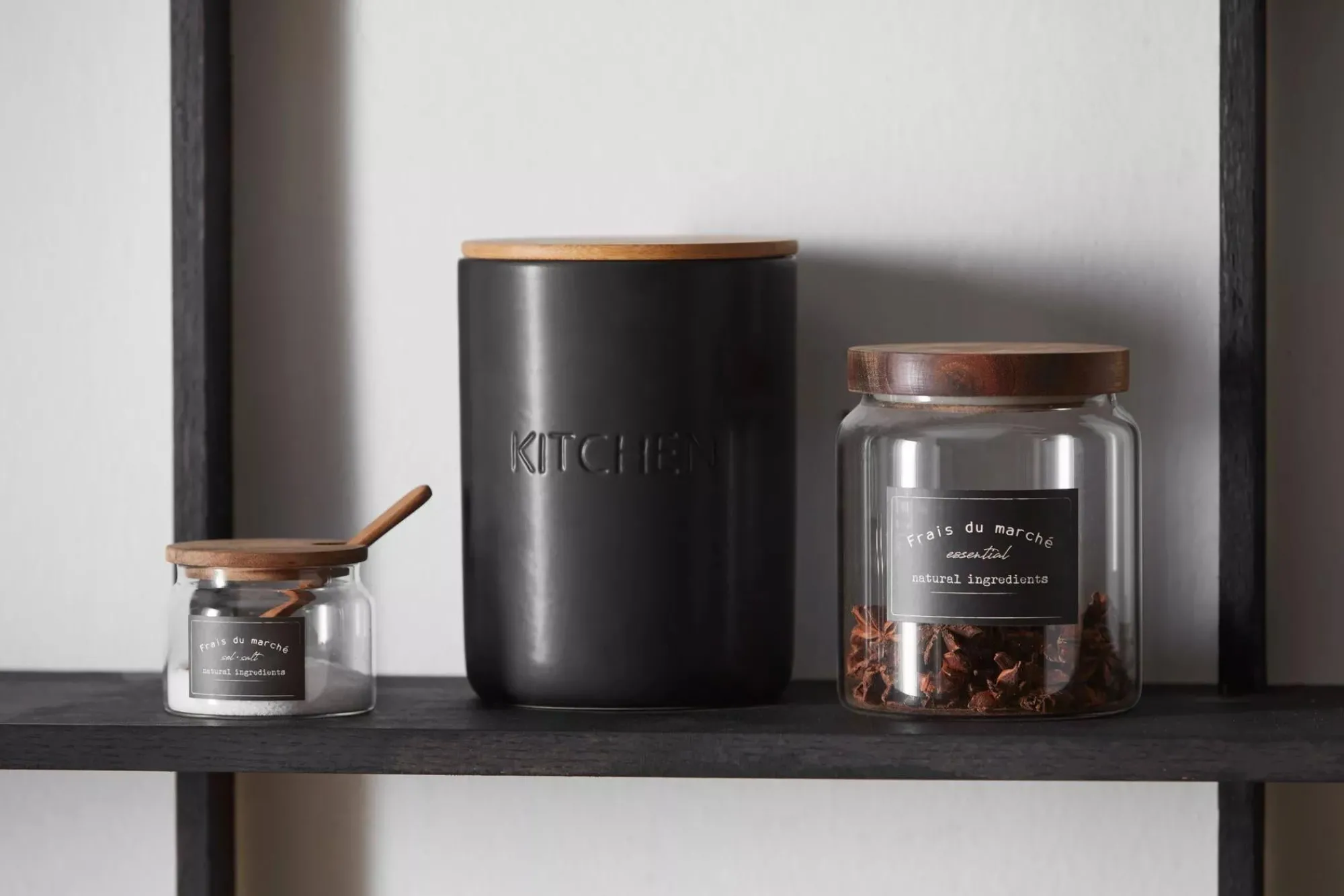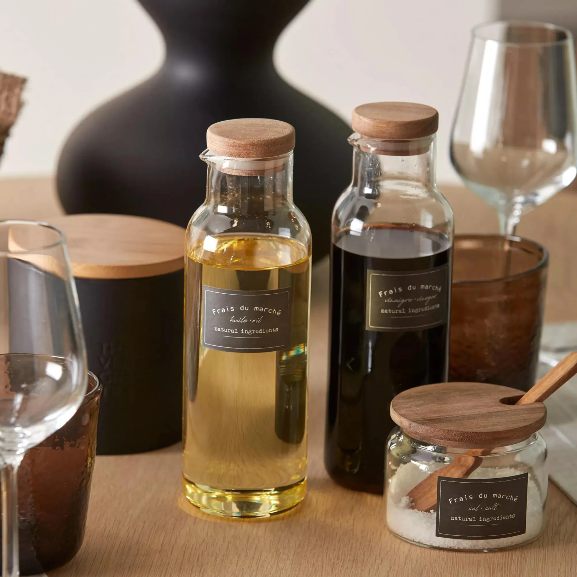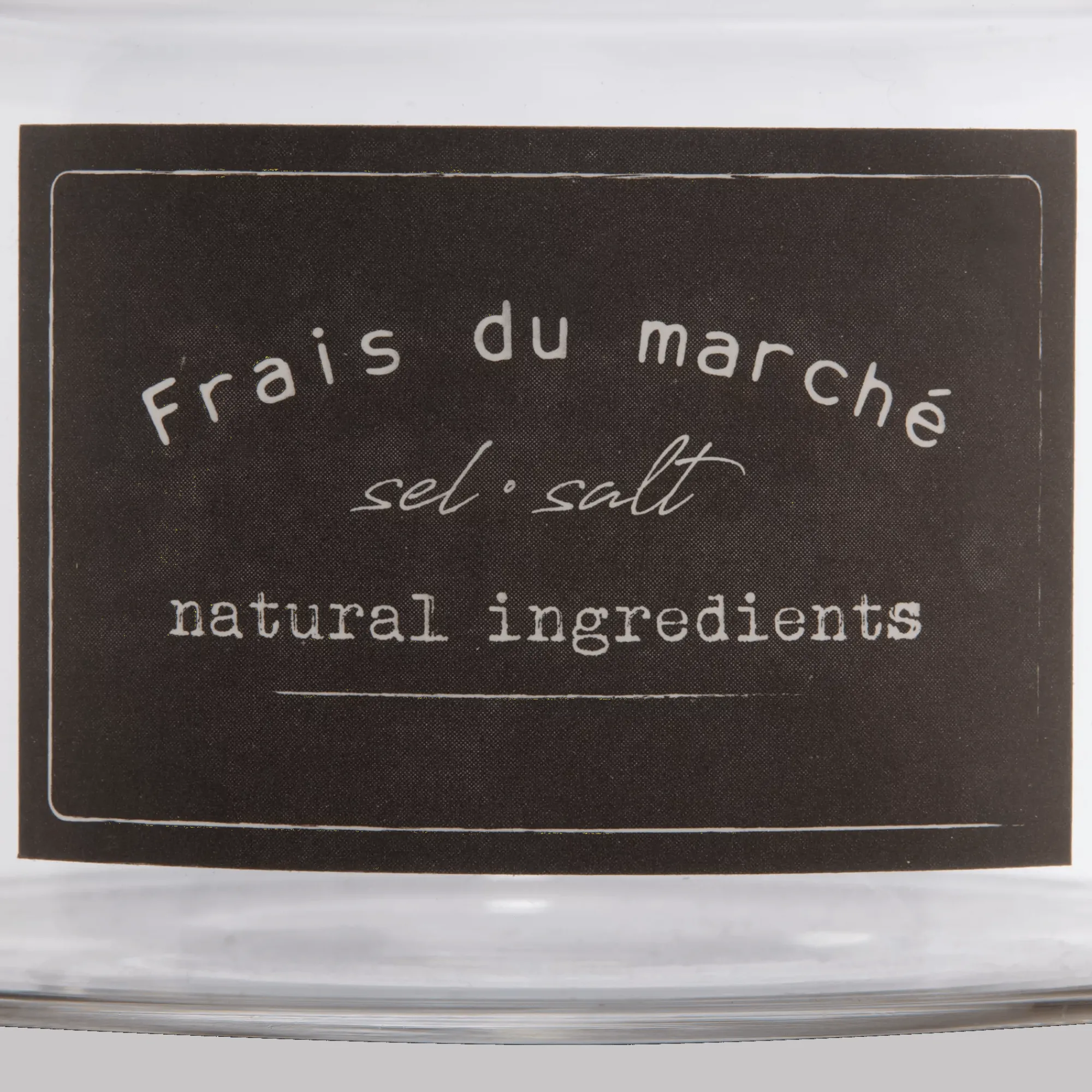 Introducing our Clear Glass Container with Wood Lid! This small cute jar is perfect for storing and displaying your favourite seasonings. This clear glass storage recipient is a stylish and practical addition to any kitchen. The wood lid adds a Beige touch and keeps your contents fresh. It features a signature black label with the phrase frais du marche and is made for holding salt and other uses.