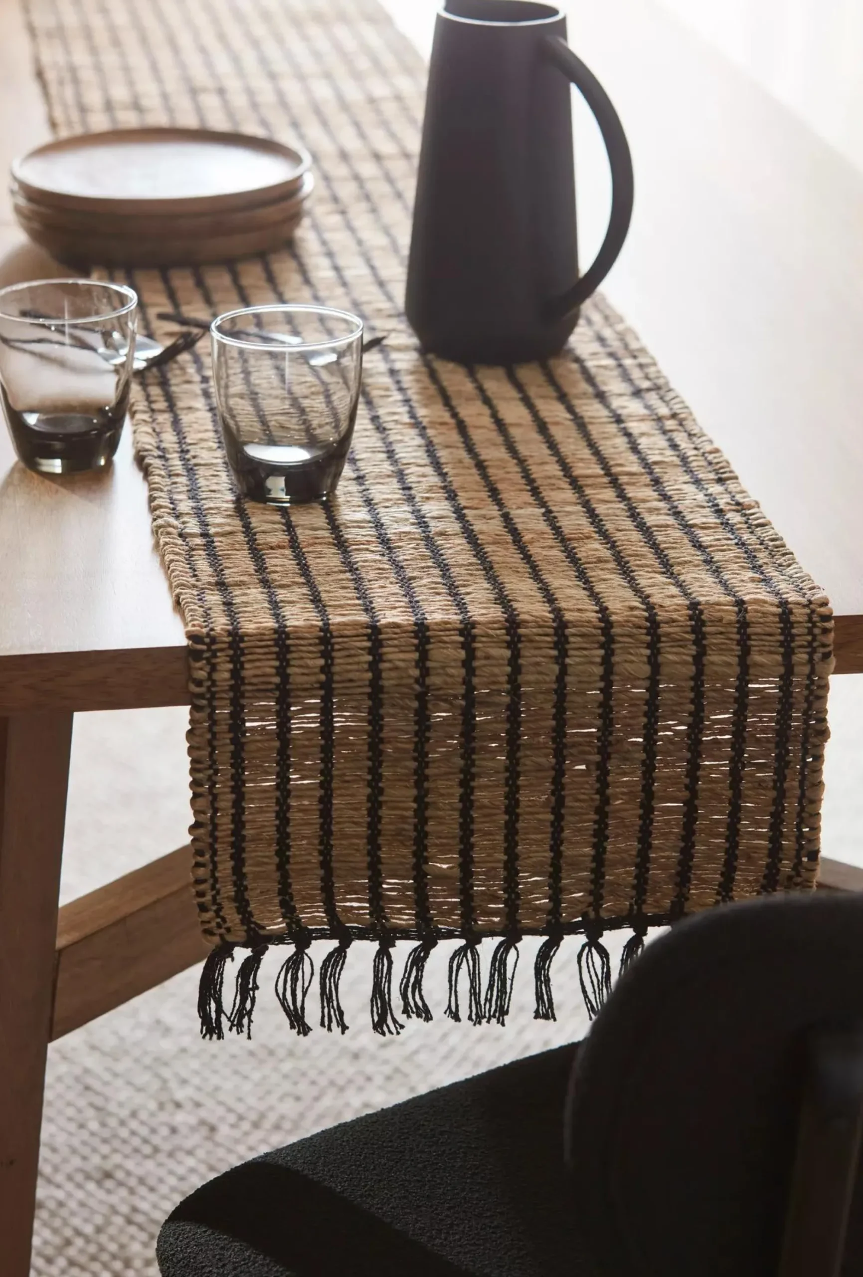 Introducing our Beige and black table runner a stunning addition to your dining table that effortlessly combines organic charm with contemporary elegance. Crafted with high-quality materials this table runner showcases a harmonious blend of Beige fibers and sleek black accents. The earthy neutral tones of the Beige fibers bring a touch of warmth and Brownic beauty to your table setting while the contrasting black details add a modern and sophisticated twist.