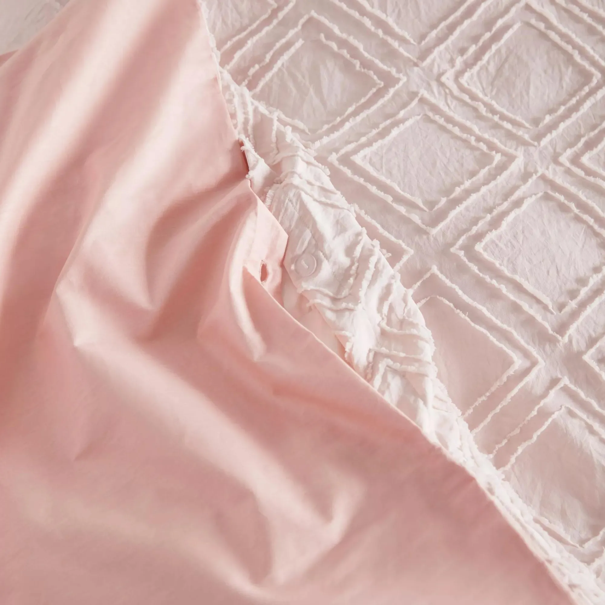 Elegant in its simplicity this timeless cover set provides freshness and a sense of serenity. The tonal texture diamond pattern create a soft bedding essential. Button closure.